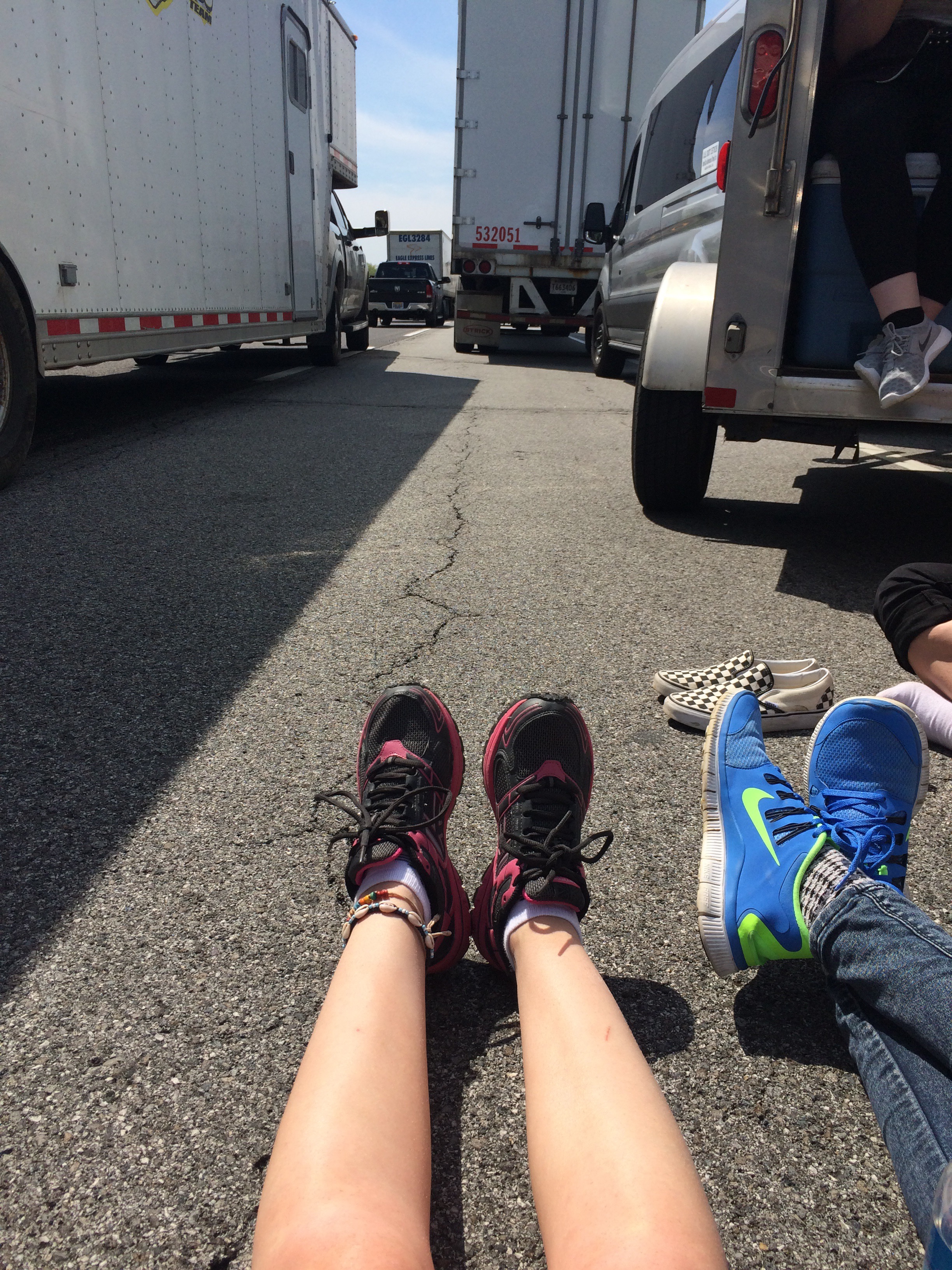 After wandering around and grabbing lunch, we headed for Chicago. We were slightly delayed leaving Shipshewana when a guy who looked like Santa Claus started chatting to JD about the van. Santa kept chatting despite JD being sat in the van with the engine running. We were probably delayed for a couple of minutes. Later up the road, there was a 5 vehicle accident just ahead of us. 1 or 2 minutes earlier and we could have been involved in it. Santa was sent as our guardian angel!! The road was closed for over an hour. It was really warm so we sat on the road to catch some sun while we waited for the road to reopen.