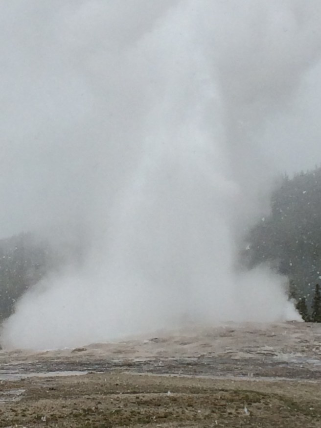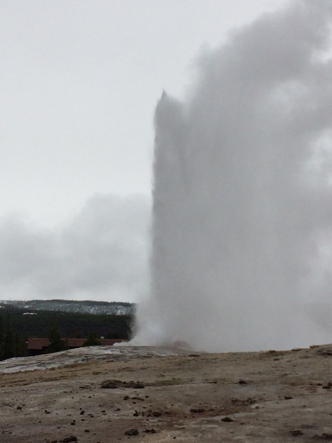 Then it was onto one of the main draws of Yellowstone – Old Faithful Geyser. I’ve seen geysers go off before in New Zealand. Lady Knox Geyser near Rotorua goes off every day at about 10am with a little help from the park staff. But Old Faithful goes off approximately every 90 minutes without any human intervention. It was snowing whilst we were there. It’s fair to say I was not anticipating snow when I packed in December, so I had to resort to wearing most of my clothes to keep warm!