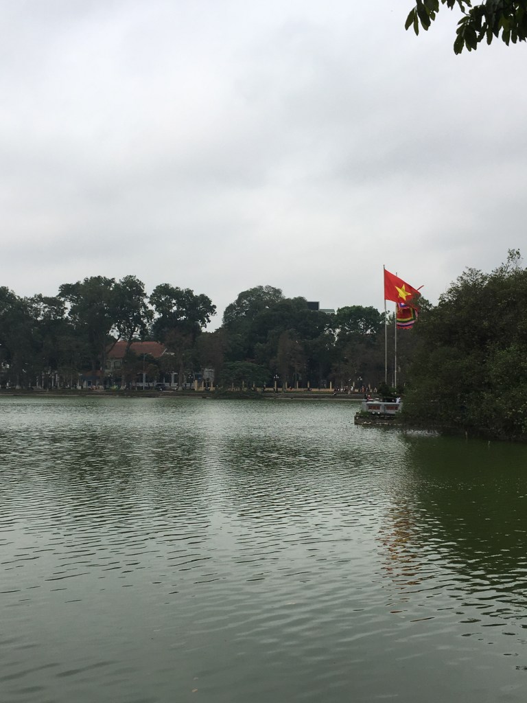 After a long sleep, I awoke refreshed on the second day and after breakfasting in the hotel, I set off exploring Hanoi. One thing I had been warned about prior to this trip was that attempting to cross the street in Hanoi would be an interesting experience, certainly if you waited as you would in the U.K. for a break in the traffic, I’d still be stuck on the wrong side of the street now! It is a little unnerving basically having to walk out into traffic but, unbelievably, it works. Most people in Vietnam ride scooters as the taxes on (usually imported) cars are prohibitively expensive, and they are used to adjusting their speeds for pedestrians. After building up confidence to cross the street, I made my way to Hoan Kiam Lake and walked around it, enjoying the early morning sights including the locals enjoying some early morning yoga/meditation along the shores.