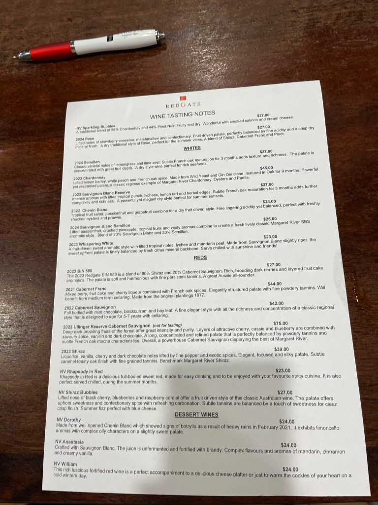 After lunch in Augusta, we headed for our first wine tasting at Red Gate winery. A very comprehensive tasting, I reckon at least a dozen wines from the list below, and unusually for me, my favourites at this stop were a Chardonnay and a Cabernet Sauvignon.