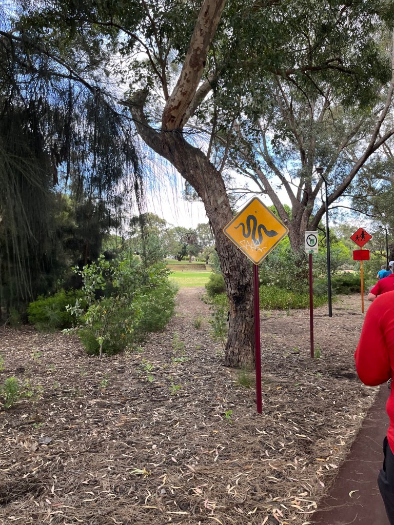 The next day was Saturday, which means parkrun. Parkruns in Perth start at 8am so I just about had enough time to walk the 20 or so minutes to Claisebrook Cove parkrun, huff and puff round the 5k in 35 minutes, walk back to the hotel to shower and then walk the 30 mins to the stadium in time for the first ball of day 2 at 10.20am. It was a slightly frantic morning, which included some interesting warning signs along the parkrun course…