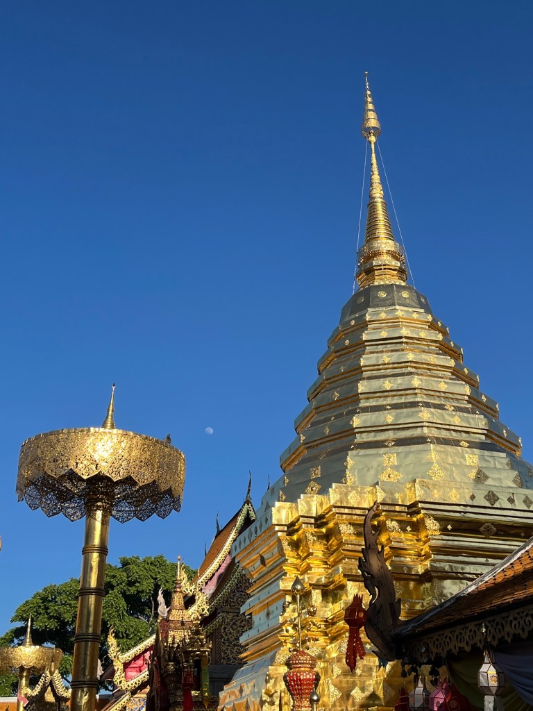 In the afternoon we had a trip to Doi Suthep temple, high on the hillside just outside of Chiang Mai. Even once you’ve driven up the windy hillside to get to it, there are still 300 or so steps to walk up to reach the temple. Again it was busy with people enjoying the holidays but there was a lovely peaceful air there