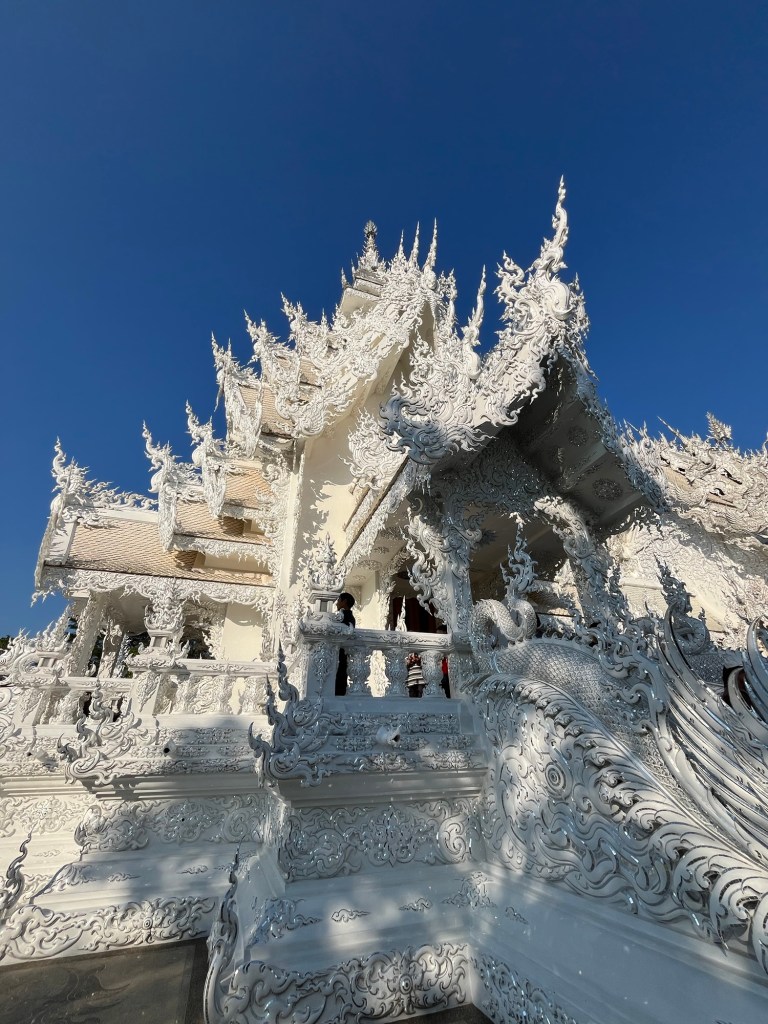 After a free morning on New Year’s Day, we set off to the border town of Chiang Khong, stopping at the White Temple in Chiang Rai on the way. A very different style of temple to others seen so far, and much more contemporary, but the contrast of the white with the sky and surroundings is spectacular