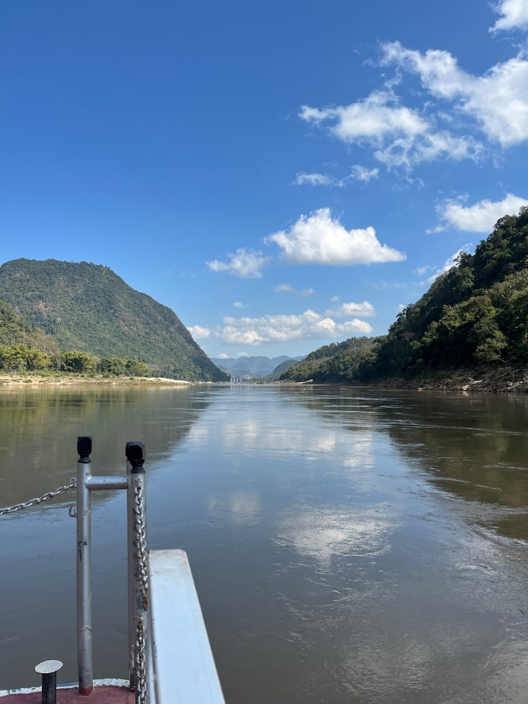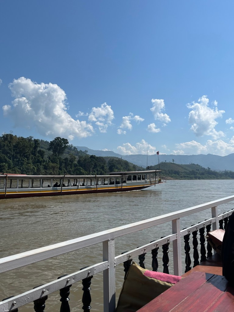 After the border formalities, we drove a short distance up the river to get on a slowboat which would be our transport for the next 2 days to take us down the Mekong River to Luang Prabang. It’s early January and winter here, though definitely a different winter to the UK! There was a chill in the air in the morning which necessitated a couple of layers, but by mid morning when the sun came out, it was very pleasantly warm.