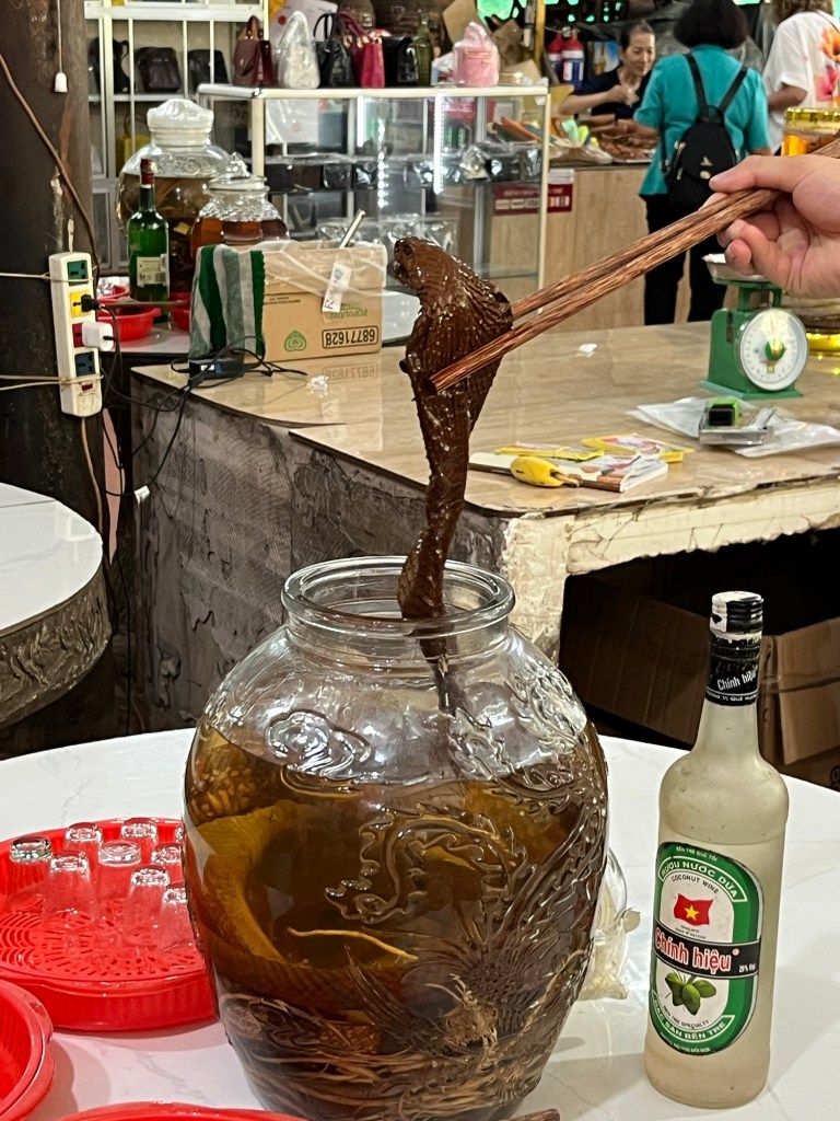 However, we still had another day in HCMC and everyone in the group had opted to do a Mekong Delta day trip. We drove out of the city for a couple of hours before getting on a boat to cross part of the delta to Unicorn Island, where we enjoyed honey tea, some local music, discovering you can pop rice like you can pop corn, ate some chewy coconut sweets and discovered snakes in wine…