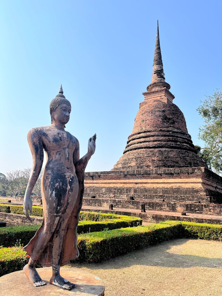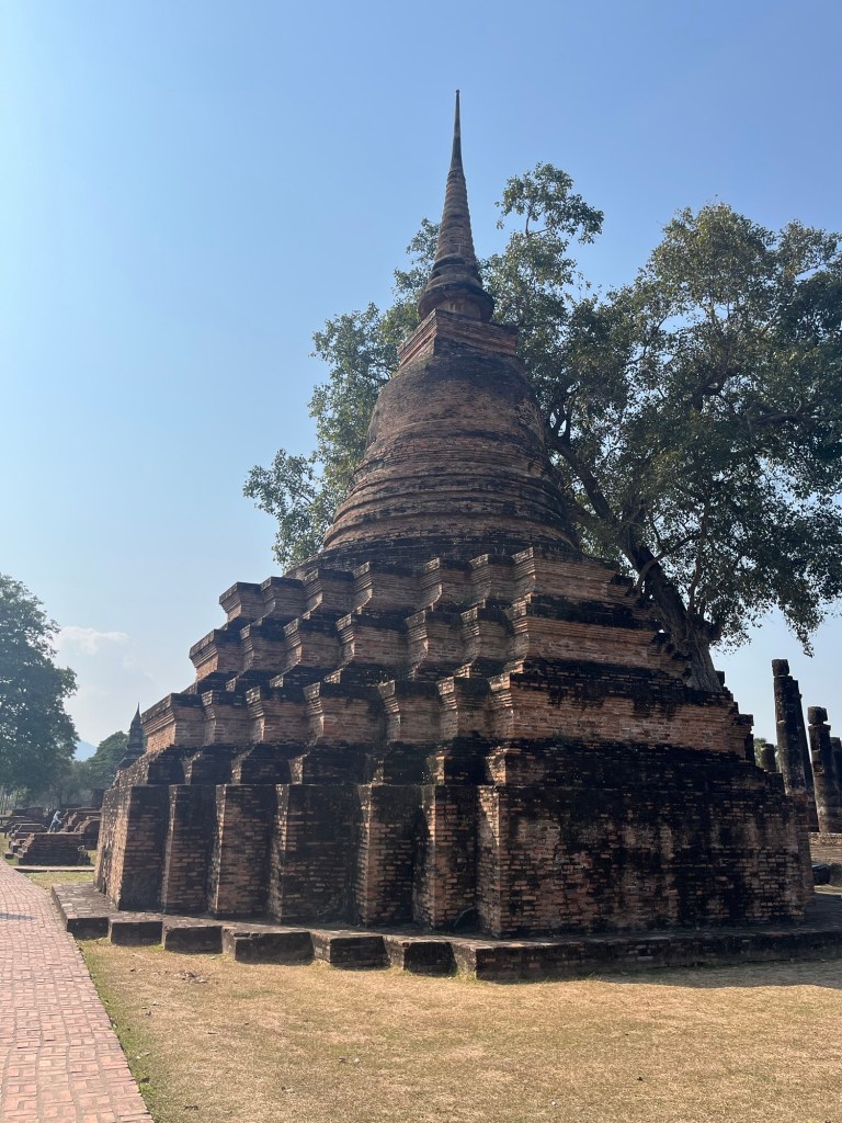 We continued south and arrived in Sukhothai in the mid afternoon. Sukhothai was the first capital of Siam, and is now a historical park with the ruins of hundreds of temples. It’s possible to cycle between the ruins (motor vehicles are not allowed within the park) but I was not quite dressed for cycling (I had a long skirt on suitable for the temple in Lamphun) so took a golf buggy instead, definitely a better option in the heat! The temples here, some ruined, some having been restored, are in the Khmer style and again I could see some similarities to Angkor.
