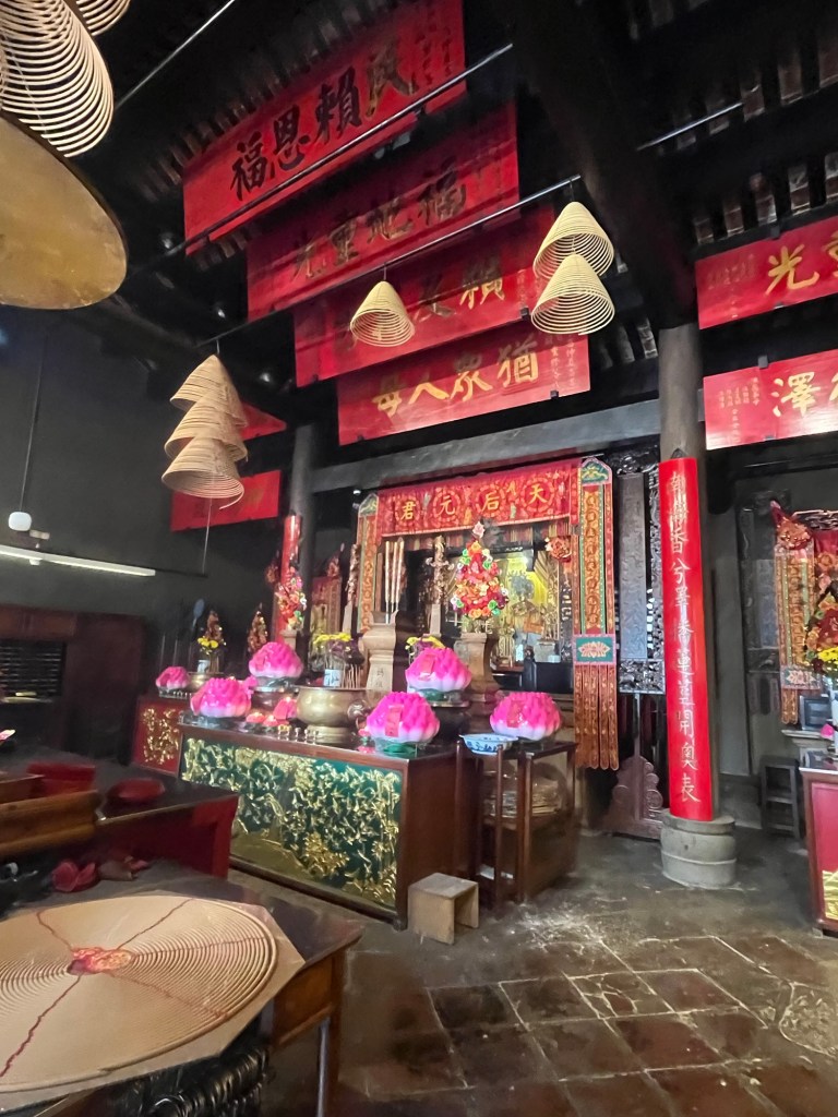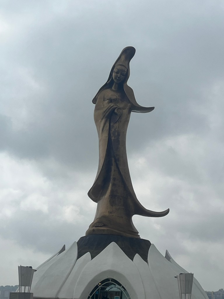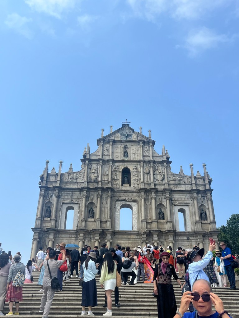 After taking a ferry over in the morning (about an hour), and going through immigration, we met with the tour guide in Macau. We started by going to the Kun Iam statue on the waterfront. This is a large statue dedicated to the goddess of mercy. Afterwards we drove past Macau Tower and saw some people bungee jumping off it (no thank you!) before heading to A-Ma Temple, one of the oldest in Macau. It was very busy with tourists and lots of burning incense.