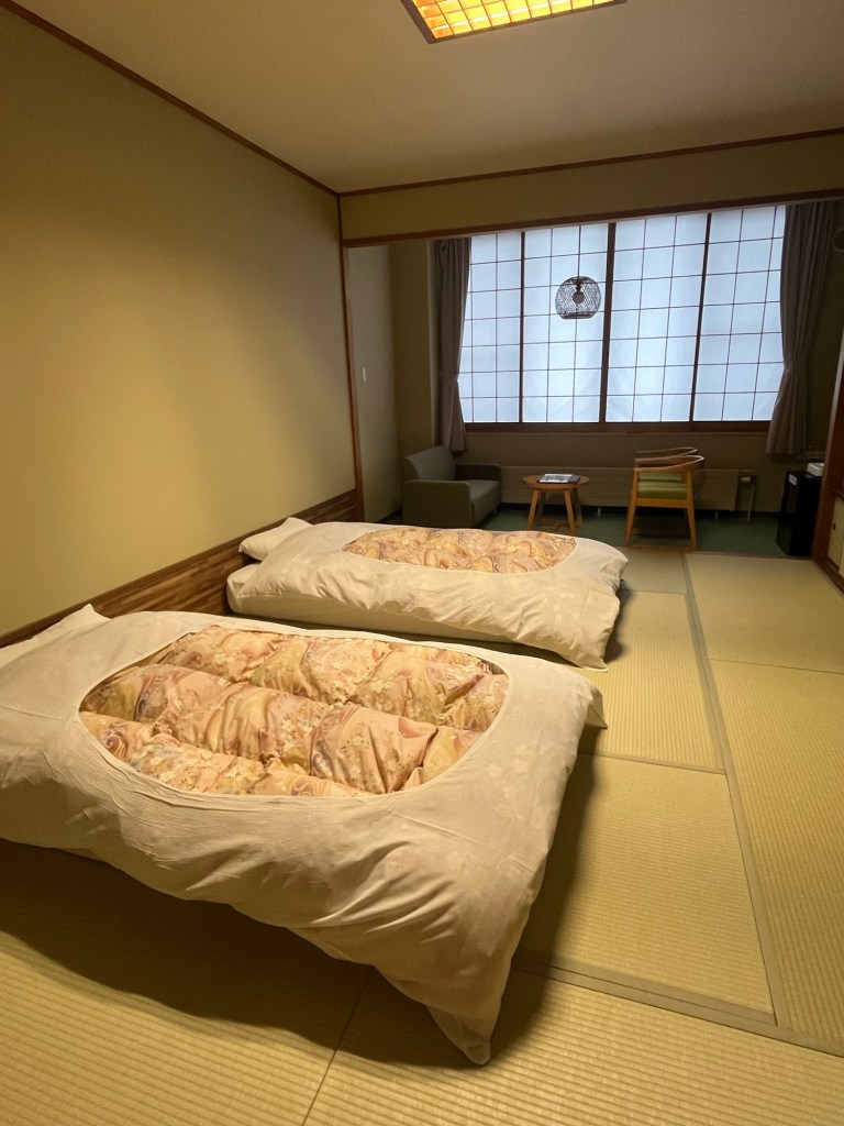 We stayed at a ryokan on the lake this evening, with another onsen. Ryokans are traditional Japanese inns and have futons and tatami mats in the rooms, and the only bathing and showering facilities are in the onsen. What a good excuse for another long and relaxing soak…