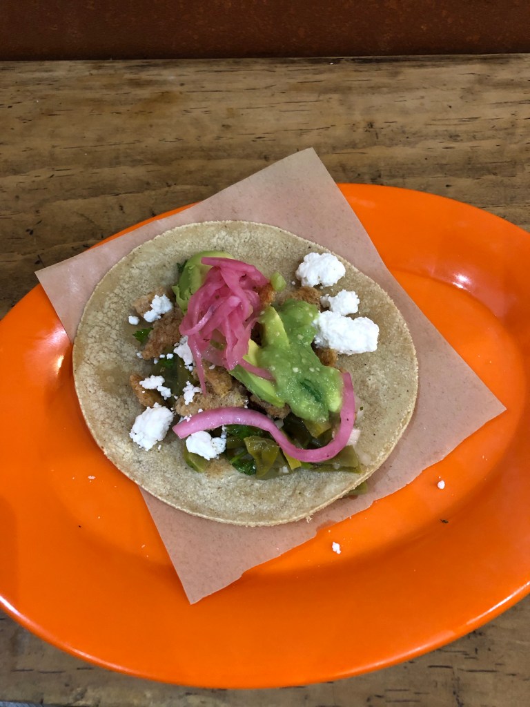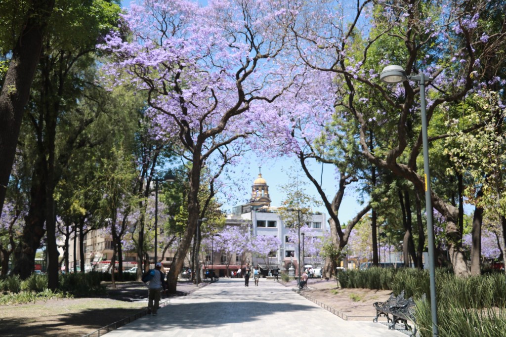 I was met at the hotel by my guides and we took a local bus and then the Metro to the historic centre of Mexico City. We emerged from the metro onto the Zocalo, the main plaza in Mexico City. We visited the Templo Mayor and its museum which contains heaps of artefacts from the excavation of the site, and lots of history on the Mexica peoples. We popped into the cathedral briefly as mass was taking place, and then walked through the streets towards the Palacio de belles artes (Palace of Fine Arts) and Alameda Park. The trees all around the city had this gorgeous purple blossom (I visited in March 2019).