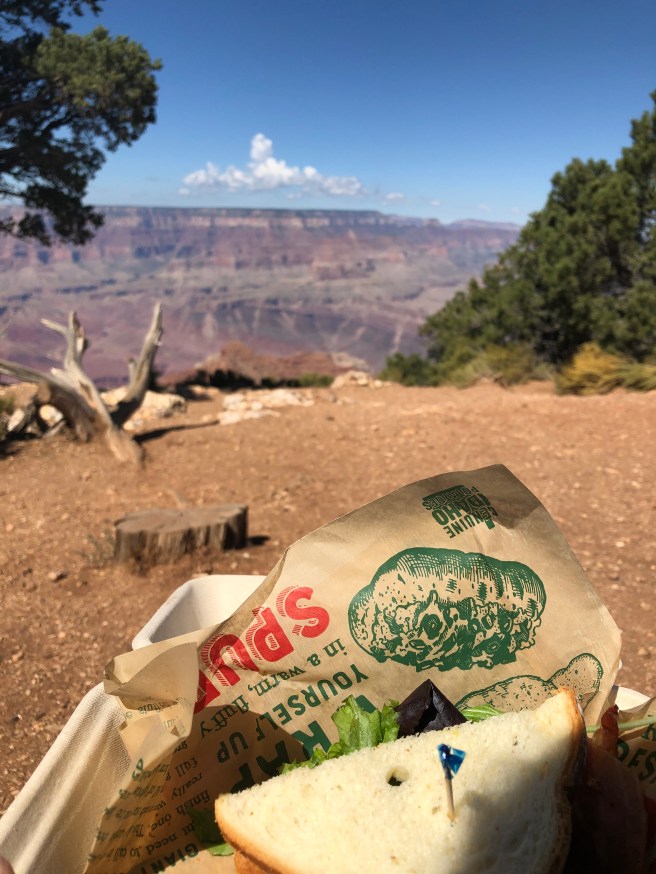 We approached the Grand Canyon from the east, so our first glimpse of it was from Desert View. On the way, we’d stopped off at a deli for a packed lunch, and so we enjoyed our lunch with a view over the Grand Canyon, a pretty epic lunch-spot, I think you’ll agree: