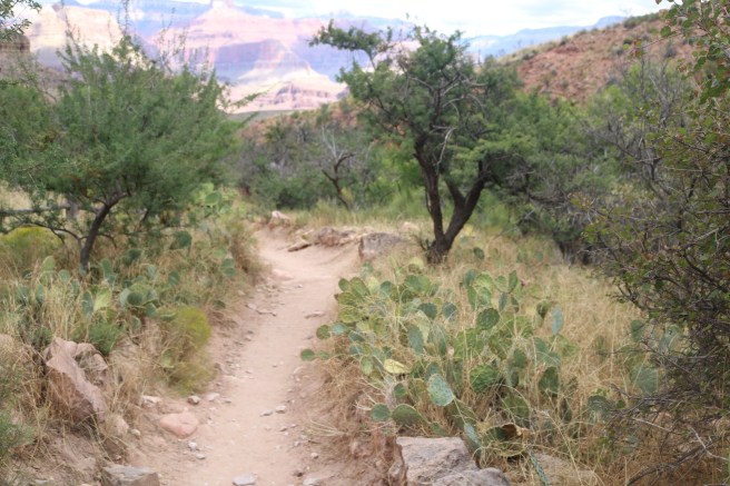 We left at 8am and our tour guide drove us into the park. Grand Canyon operates a shuttle bus system to get around the South Rim, and so we hopped on a shuttle bus to take us to the Bright Angel Trailhead. The Bright Angel trail is a there-and-back trail with turnaround options at the Mile-and-a-Half Resthouse, the Three Mile Resthouse, Indian Gardens (at 4.6 miles) and Plateau Point (6 miles). The hike to Plateau Point and back is longest day hike, at just over 12 miles and going over 3000 feet down into the Canyon. Going to the river and back in a day is not an option.